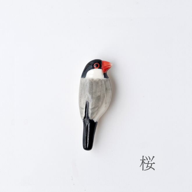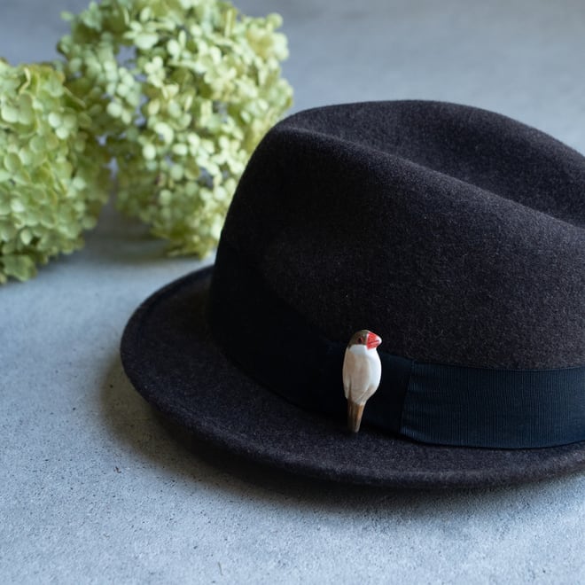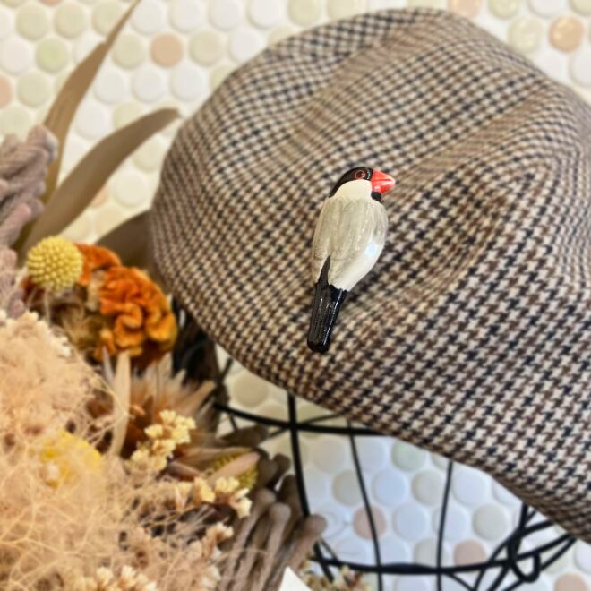 白、さくら、シナモンの3種の文鳥ブローチです。お家でかわいがっている子の代わりに、お出かけに連れていってあげてください。