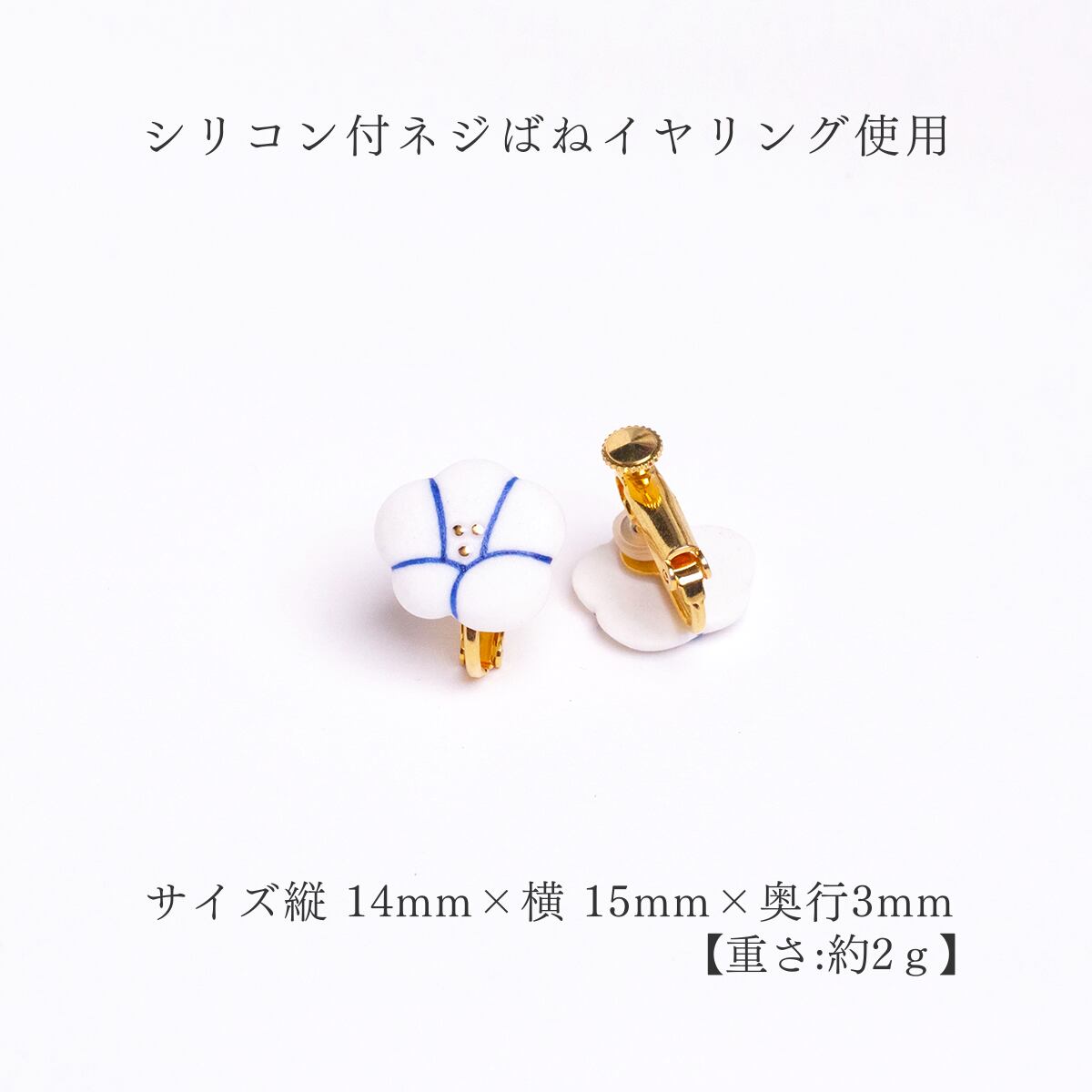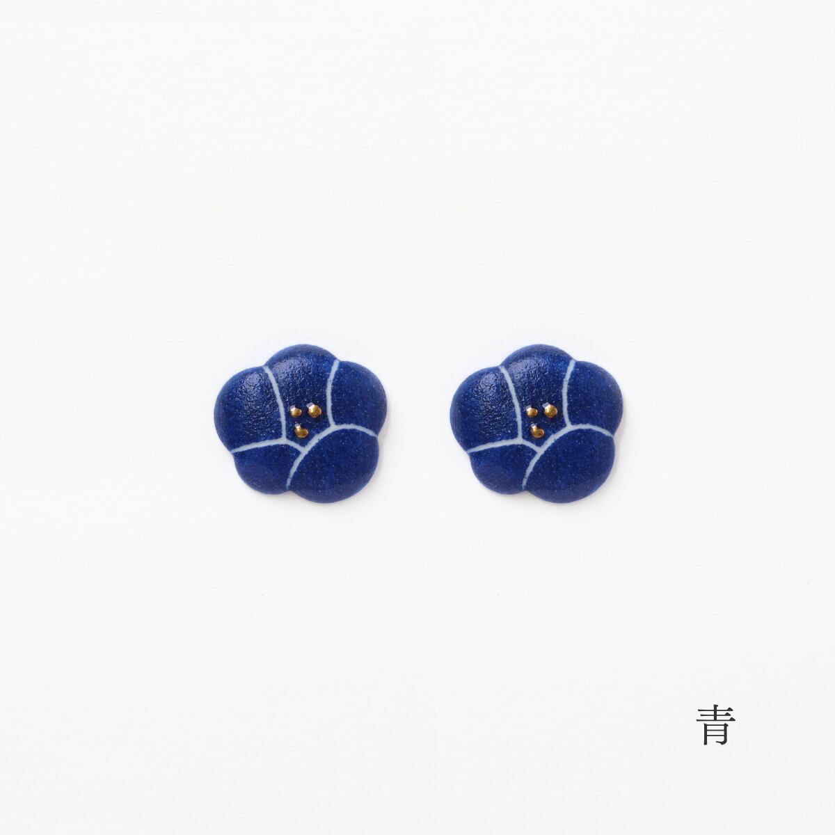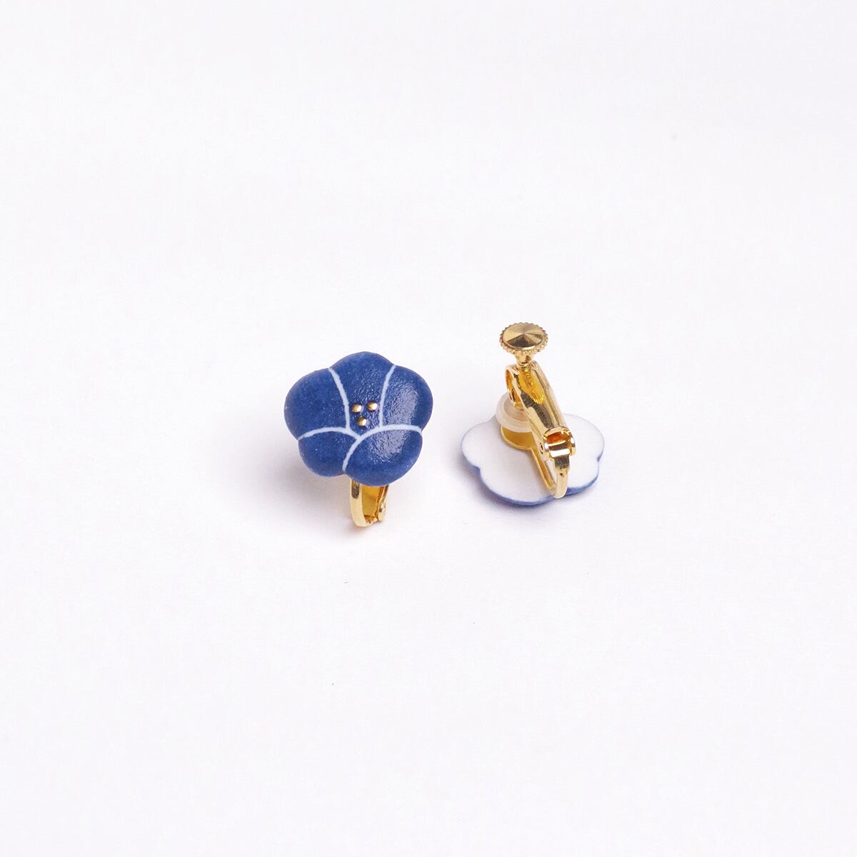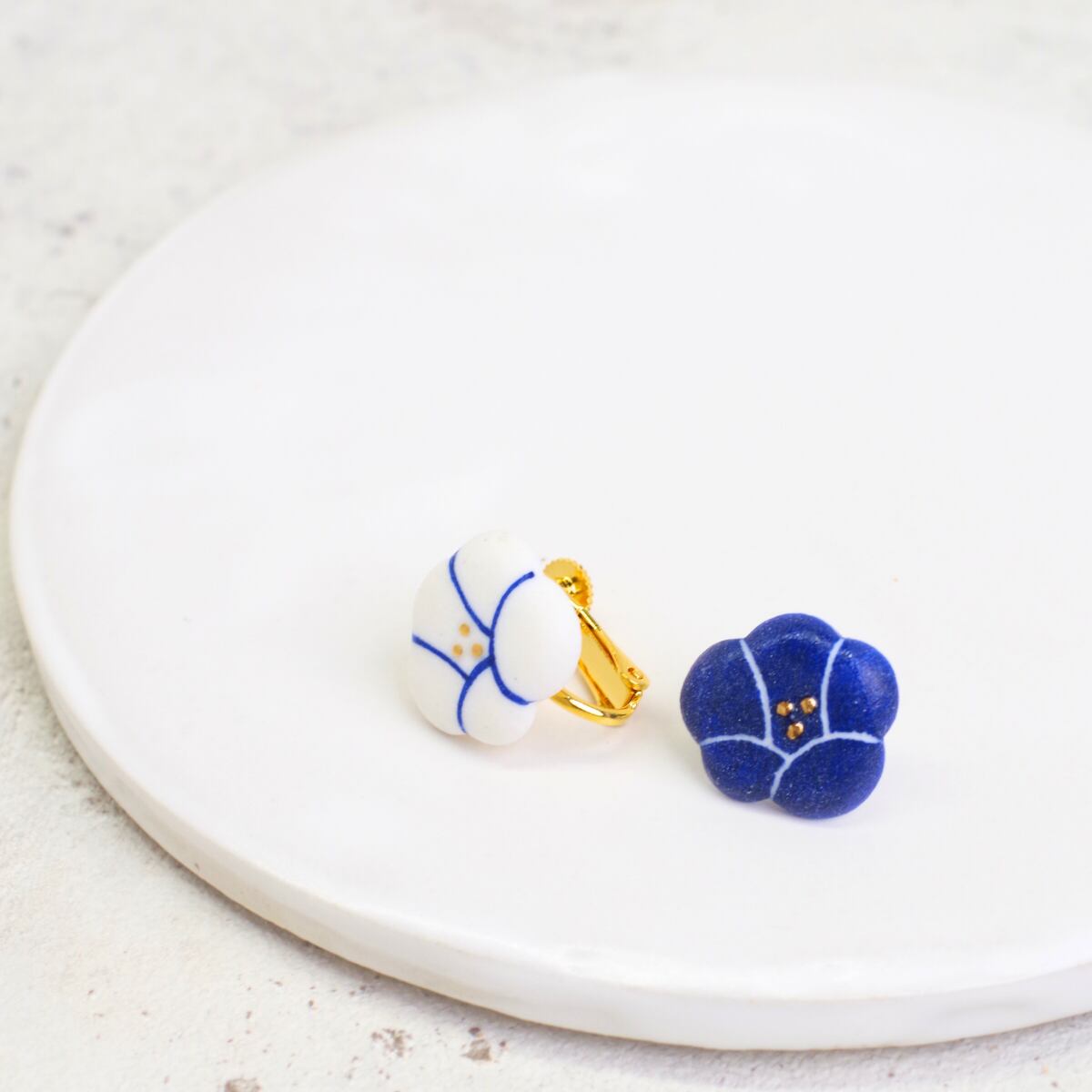 ころんと丸みのあるフォルムで咲く、凛とした梅の花。柔らかさをまといながら、青と白のコントラストですっきりとした品の良さを演出。シンプルな装いにぴったりです。