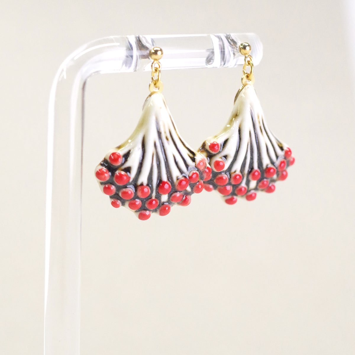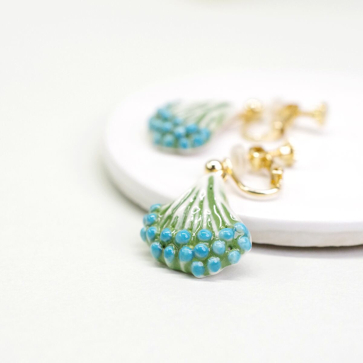 手作業で色をのせ、茎の部分までそれぞれこだわりました。耳元で揺れて柔らかな印象を作ります。