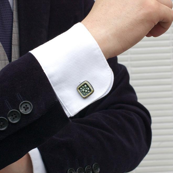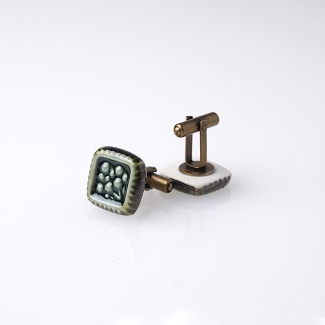 ボタン・ライクな枠の中に、素朴なお花を閉じ込めました。 色付けには、美濃焼の伝統的な釉薬である織部と黄瀬戸を使用しています。やきものの渋さとモチーフのかわいらしさを融合させた作品です。