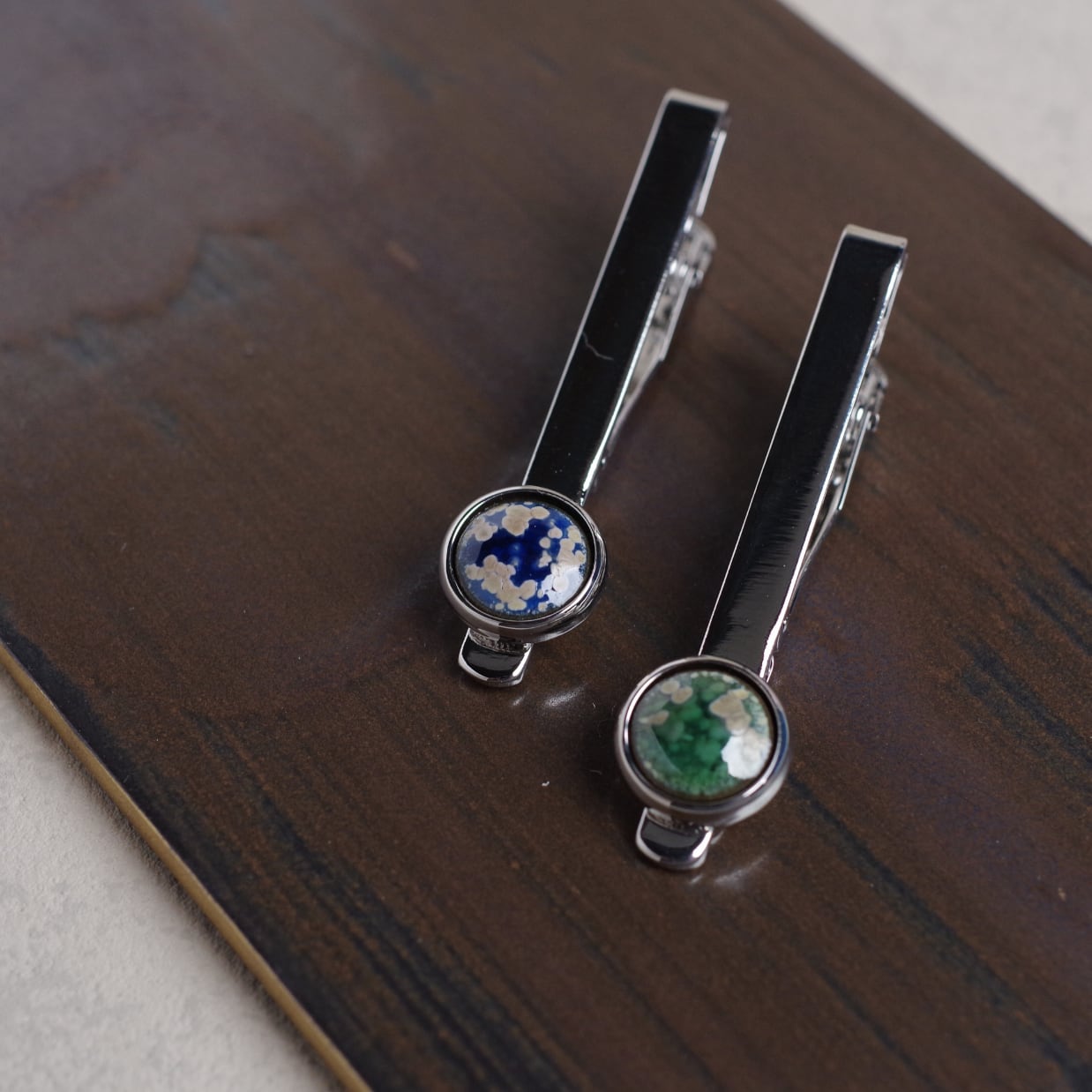 タイルのネクタイピンを作りました。シックな色合いが、どんなネクタイとも相性抜群です。